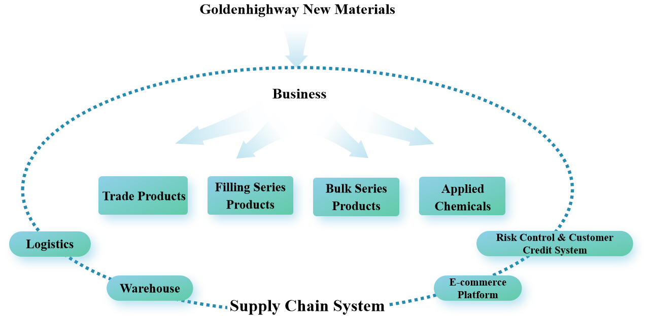 Goldenhighway New Materials Division is an important digital operation platform for the entire chemical industry chain under the GHW Group. Leveraging the Group's robust industrial resources and product portfolio, it has built a dual-wheel-driven business structure encompassing "business + supply chain systems." Its service scope has gone beyond the single polyurethane industry, covering animal nutrition, fine chemicals, basic chemicals and other core business sectors.